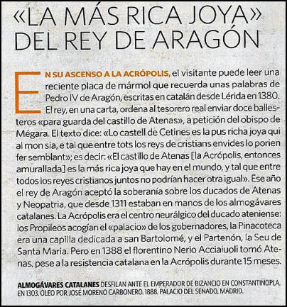 Pág. anterior Pág. siguiente en el idioma CATALAN las preciosidades de la ciudad, donde los CATALANES almogávares había conquistado recientemente. Y de la resistencia CATALANA frente al florentino invasor. Son tantos los improperios que no podemos dejar pasar por alto tamaño desafuero y denunciar la suma ignorancia intencionada o no, de este articulista que, siendo benévolos, su desconocimiento le lleva a falsear la historia drásticamente.  Bien desde esta asociación se sugiere al escritor que, si no sabe, no haga, pues el hacer sin saber, además de colocar a su autor en un lugar incómodo, denota la pésima calidad de la enseñanza universitaria que hoy, como en otras cosas arrostramos para perjuicio y vergüenza ajena. Cada cual en su especialidad puede dar de sí mucho y enseñar más, las invasiones a otras con grave desconocimiento e irresponsabilidad confunden al lector indocto, generando situaciones que nunca existieron y difícilmente existirán.  De los almogávares  no hablo porque no quiero hacer más mella en el filo de la ignorancia, del que hace gala tamaña aberración. El partidismo político puede usarse en muchas especialidades, medicina, ingeniería, sobre todo periodística, pero nunca, repito nunca, en la Historia, porque entonces ya no hablamos de historia, sino de cuentos chinos.  Además, esta ciencia está sujeta a un método, como todas ellas, que los invasores desconocen, lo que los lleva a tropezar continuamente con el cordón de su zapato. La seriedad y responsabilidad del historiador, ha de ser profunda, hay que huir de las banalidades, esas quizás tengan más cabida en otras ramas, pero de ninguna manera en la Historia, tal vez porque se analizan datos históricos, datos del pasado que son ciertos y cuando son aproximados, se hace constar, y cuando se presumen falsos como el que nos ocupa pues con mayor motivo, solo se tenía que haber hecho una pregunta ¡un filólogo! ¿Cuánto nos ha costado a los españoles colocar allí semejante engendro?. En fin, leguleyos de la tecla hacen patria donde nunca la hubo.
