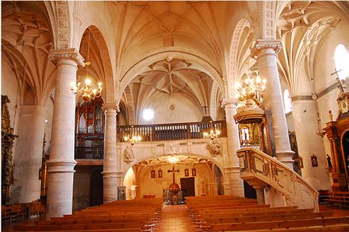 El templo comenzado por Alonso de Lezmes, tardó casi un siglo y medio en construirse (1526/1664 a pesar de ello ofrece una unidad estilística, el exterior es sobrio, de ladrillo animado por galerías aragonesas de arcos semicirculares, su planta es basilical de tres naves cubierta con bóveda de crucería que apoyan sobre seis columnas con capiteles jónicos y rematada en una testera tricóntida cuyos ábsides son de planta cuadrada excepto el central que es poligonal.